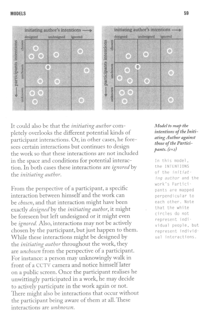 INTENCIONES: desde el punto de vista de los participantes, las interacciones pueden ser “elegidas, sin elección, desconocidas o ignoradas”, ¿cómo traducimos nuestras intenciones a un diseño tecnológico? ¿Hay decisiones de interactividad que escapan nuestro control/diseño?